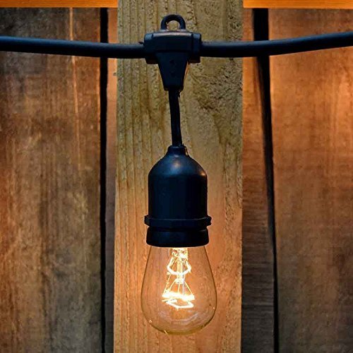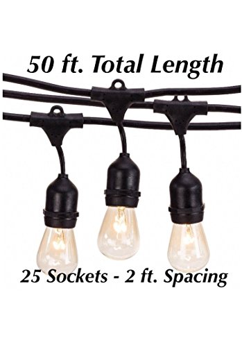 Outdoor Patio String Lights - Heavy Duty Hanging Patio Lights - 50 Feet With 25 Hanging Sockets - 30 11 Watt Incandescent S14 Bulbs Included - Black Wire - Weatherproof Commercial Grade - Bistro Style