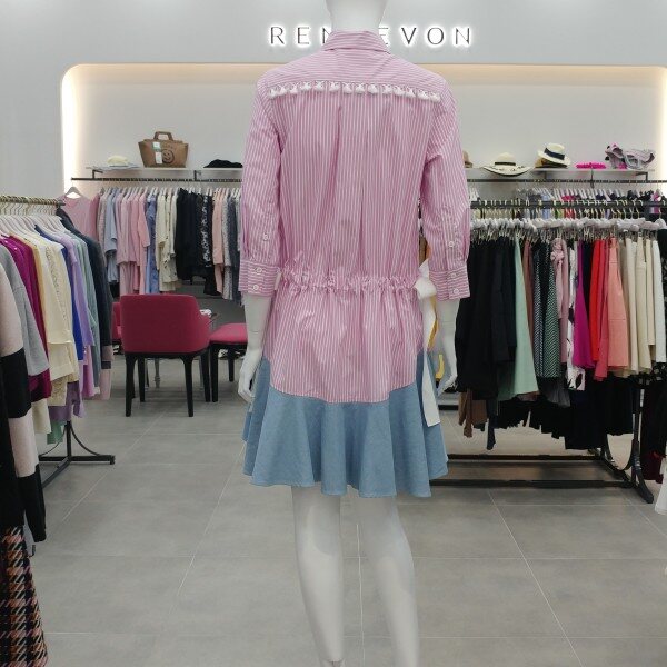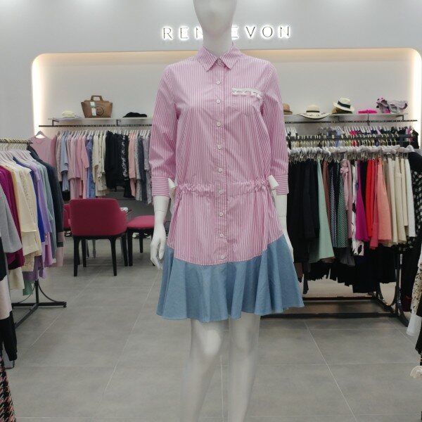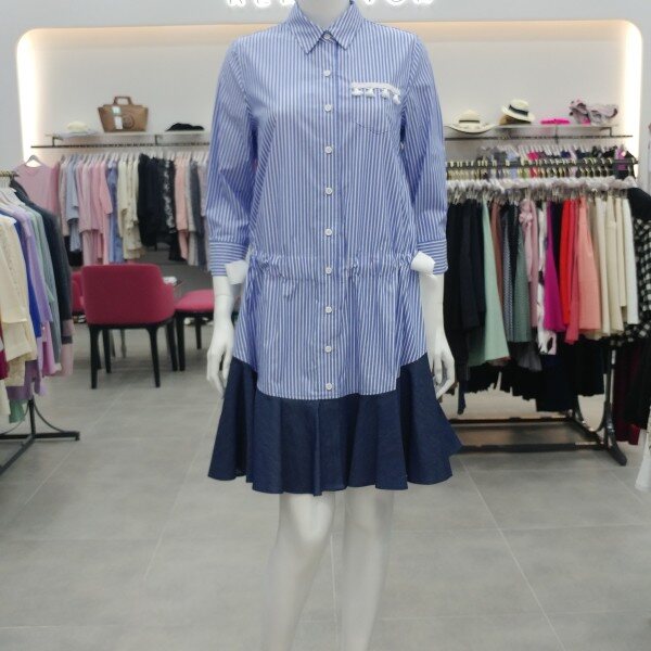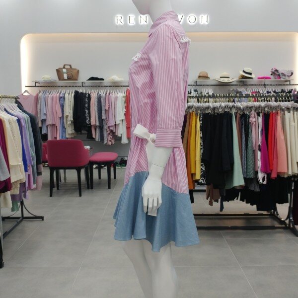 경쾌한 스트라이프 원단에 밑단 데님 배색감을 사용한 귀여운 느낌의 원피스 입니다