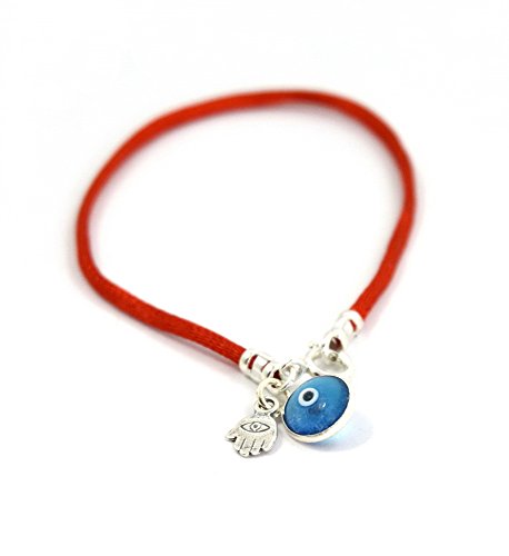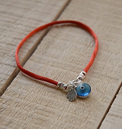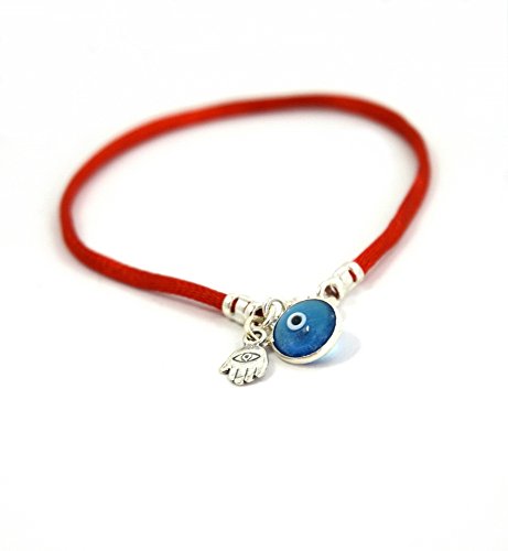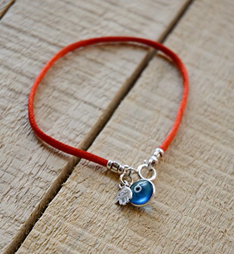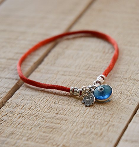 Red silk string bracelet with Hamsa against the Evil Eye and blue glass Evil Eye for protection.