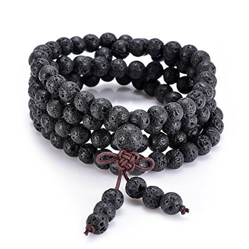 Material - 8MM natural lava stone beads, these beautifully polished stones are threaded onto a flexible and strong elastic cord (measuring roughly 34 inches), which allows the piece to be worn as either a wrap bracelet or mala necklace.