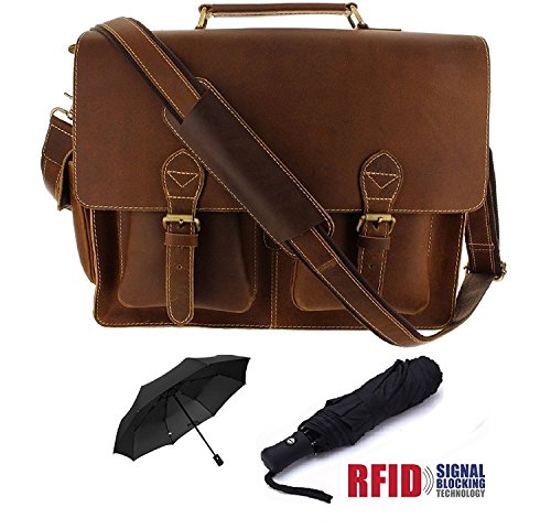 -. Brand : Viosi -. Color : Hunter Brown -. Department : mens -. Feature : LEATHER MESSENGER BAG: Our family business here in Los Angeles offers a 10 year no questions happiness guarantee. Only product in its class that is certified by TÜV (Germany) for RFID shielding for all common frequencies. Keeps your credit cards safe from identity thieves. / SUPERB QUALITY - New and Improved Leather Treatment to eliminate color transfer. Made from the finest selection of full buffalo hides, which offers maximum strength and minimal stretch. / FEATURES - Unique under flap twin pockets with magnetic closure | 2 outside side pockets - 1 with magnetic closure and 1 open for your umbrella | Large zippered back pocket | Interior features: zippered pocket and 2 open pockets along with pen holders plus a padded laptop holder with padding and Velcro closure and Removable adjustable shoulder strap. / SUPPORT/DIMENSIONS - Your bag comes with a 10 year no hassle warranty by our California based family business.16(L)" x 12(H)" x 3(D)" / PERFECT GIFT - Your Leather Messenger Bag comes with an RFID Magnetic Money Clip or a Premium Umbrella -. LegalDisclaimer : Your Viosi Leather Messenger bag has a 10 year warranty which covers any part of the messenger laptop bag which does not hold up under normal usage. -. ProductGroup : Apparel -. ProductTypeName : LAGE -. Size : 16 x 12 x 4-1/2 -. Title : Viosi 16" Genuine Leather Laptop Briefcase Messenger Bag Front and Side Pockets with RFID Protection