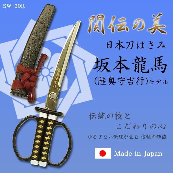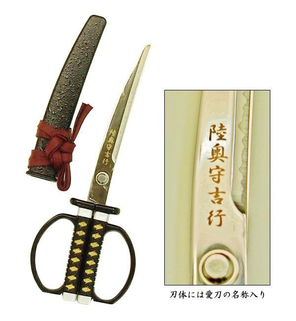 坂本龍馬の愛刀・陸奥守吉行をモチーフとしたハサミで、刃体の反りと刃紋にこだわりをもった作りとなっております。鞘は高級感漂う黒石目調で、刃体には愛刀の名称が入り、龍馬の威厳漂うデザインとなっております。刃物の町、岐阜県関市の職人が1本1本丁寧に刃付けをした切れ味抜群の商品です。 |