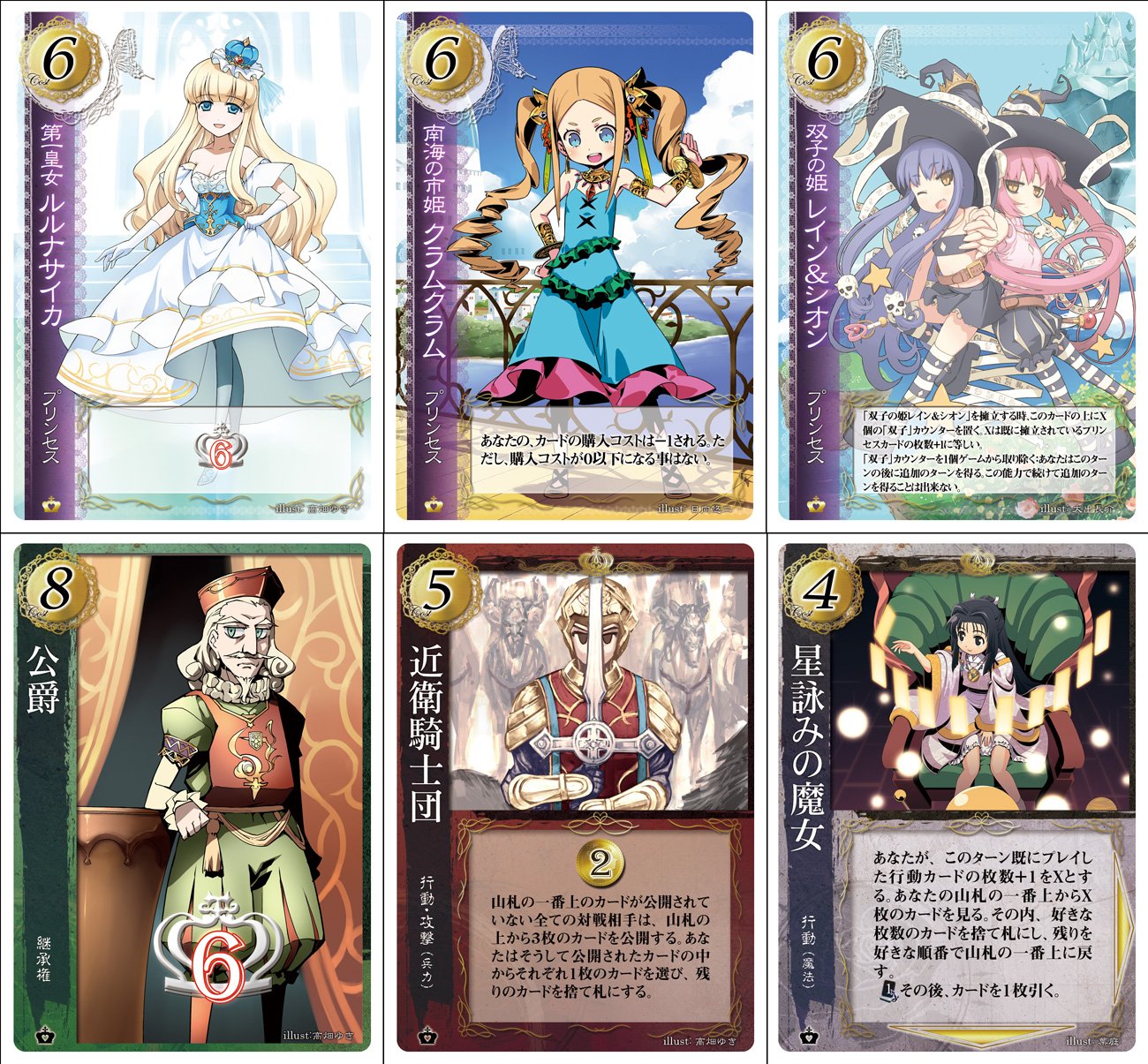 Participating players start with a common deck, collect cards according to their strategy, strengthen the deck, and aim for the ultimate victory - to attach the princess that they owned to the throne.