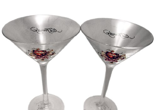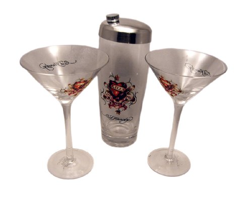 Mix up a batch of your favorite 'tinis, martinis, appletinis or otherwise, with this beautiful officially licensed Ed Hardy "Love Kills Slowly" Martini set. The set comes with 2 13 ounce martini glasses and a 24 ounce shaker with metal cover. All three pieces have the iconic Ed Hardy "Love Kills Slowly" tattoo design. The set makes a great gift for any Ed Hardy fan.