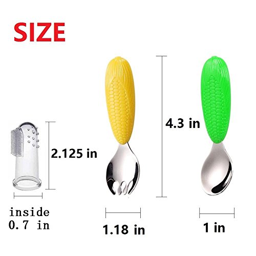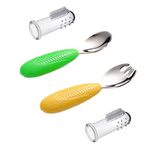 Octmami Baby Training Fork And Spoon And Baby Finger Toothbrush Set With Travel Carrying Case,Toddler Stainless Steel Fork And Spoon For durability,Finger...