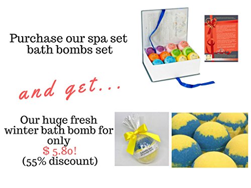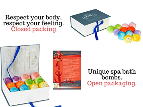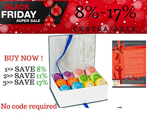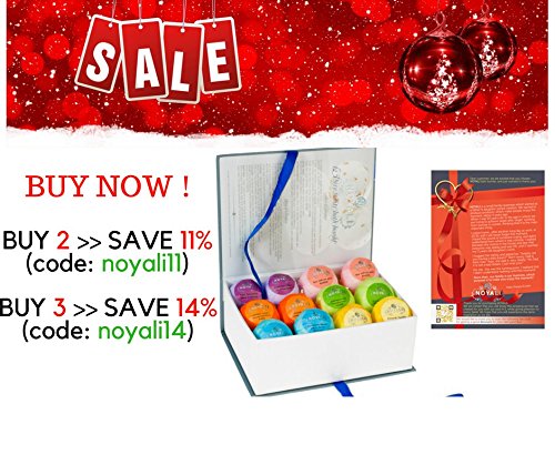 Looking for a classy, luxurious bath gift set? Choose NOYALI’S PREMIUM BATH BOMBS GIFT BOX! Each Individually Wrapped in a Unique Reusable Gift Box BENEFITS: Make your skin softer moister while restoring youthful luster preventing aging. All handmade balls have natural additions of seeds, petals, dried flowers. No colors added so no stains or oil residue on your tub or skin. For AFTER RESULTS of RELAXATION: 2 French Vanilla - AFTER a party 2 Pure Lavender - AFTER a workout 2 Pomegranate Hibiscus with Dried Flowers - AFTERnoon For DAYTIME USE to INVIGORATE 2 Calendula, Orange, Cinnamon with Dried Flowers - for the HoliDAY 2 Lemongrass with Lemongrass Leaf ? for a SunDAY 2 Rose with Rose Petals ? for a BirthDAY SIMPLE TO USE: Fill the bath tub with the desired amount of water at the right temperature. Step into the bath, unwrap the bath bomb, drop into the water. Enjoy the exploding effervescence aroma. MORE BATH BOMBS for the PRICE plus DOUBLE THE INGREDIENTS in a PREMIUM GIFT BOX. Package Includes: 6 Bath Bombs 3 oz 6 Bath Bombs 3.5 oz Gift Box (7.9 x 5.9 x 2.8 inches) Future Purchase Discount Card SATISFACTION GUARANTEE!? If you are not completely satisfied, please contact us. Click the ADD TO CART button to get the NOYALI 12 PREMIUM BATH BOMB GIFT BOX! It’s the perfect gift for that “someone special” in your life. 0 |