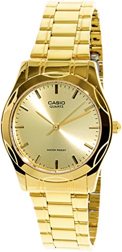 Brand, Seller, or Collection Name:Casio Model number:MTP1275G-9A Part Number:MTP-1275G Item Shape:Round Dial window material type:Mineral Display Type:Analog Clasp:Fold-over-clasp-with-safety Case material:Stainless steel Case diameter:35 millimeters Case Thickness:8 millimeters Band Material:Stainless steel Band length:Men's Standard Band width:18 Band Color:Gold Tone Dial color:Gold Tone Bezel material:Stainless steel Calendar:No Special features:measures-seconds Item weight:4.96 Ounces Movement:Quartz Water resistant depth:50 Meters