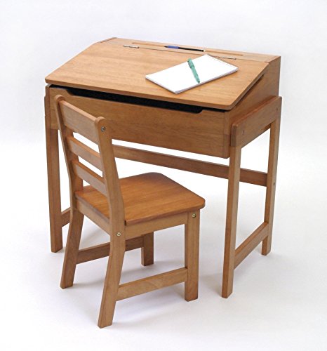 Lipper International child's slanted top desk and chair set. Like the old fashioned school desks. Lots of storage, indentations for pens and pencils. Made with recessed finger hold to protect precious fingers. Hardwood with pecan child-safe finish. Goes with any decor.