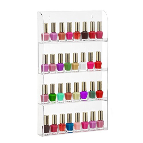 Strong, practical and durable design with four sturdy shelves to beautifully present up to 40 bottles of polish. Crystal clear premium acrylic construction allows you to display colors and brand names clearly.