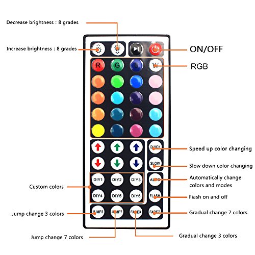 - IR Receiver 44 keys Remote Controller -- It have 6 modes: Quick , Slow , Auto , Flash , Fade change, Jump change ,RGB, DIY. And the controller’s work range up to 16.4 feet ( Pay attention to aim at the receiver when using it)