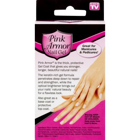 Studio : Pink Armor Publisher : Pink Armor Binding : Misc. Product Description OnTel Pink Armor Nail Gel. The thick, protective gel coat that gives you stronger, longer, beautiful natural nails. The keratin-rich gel formula penetrates deep down to repair and strengthen, while the optical brightener brings out your nails' natural beauty for a flawless look. Also great as a base coat or protective top coat. Protects against breaking, cracking, splitting and discoloring. Promotes nail growth. Provides glossy, gel nail finish. Great for manicures and pedicures. 0