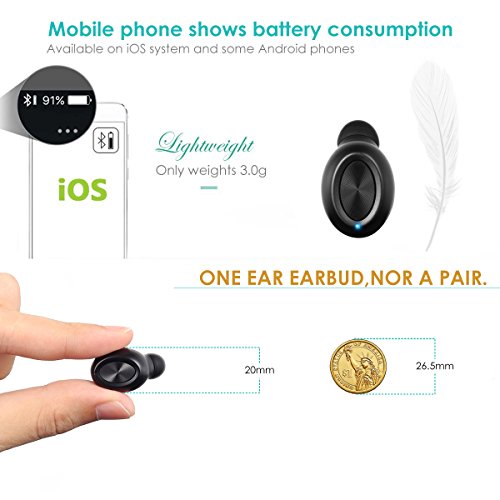 - 【High-tech Bluetooth 4.1 Earphone】: Advanced Bluetooth V4.1, support easy and fast pairing with smartphone, tablet pc, and other bluetooth-enabled devices. Connect the mini earbud with TWO smartphones at the same time, and the wireless range up to 33ft (10 meters).