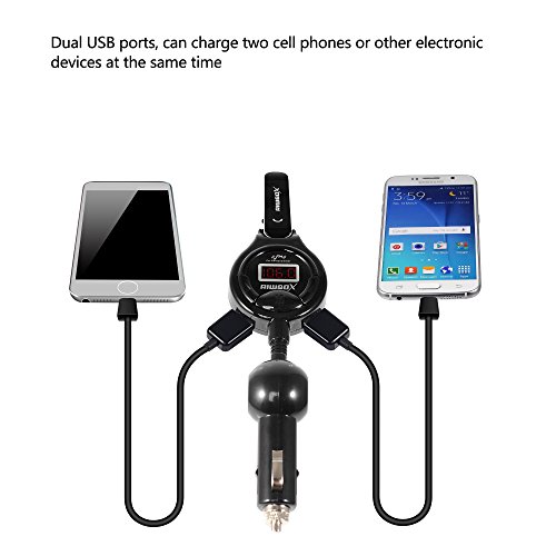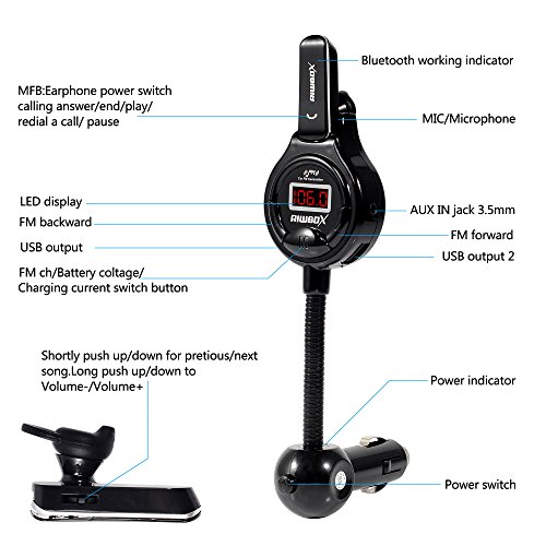 -. Feature : Multifunctional design: Hands-free calls, enjoy clear music, GPS voice navigation, charge your device. / Excellent hi-fi stereo sound quality. / Detachable Bluetooth earphone design, support handsfree talk or take P.R.Ivate conversation by earphone. / Dual USB ports to charge your smartphones, MP3 or GPS at the same time. / Package content:1xFM transmitter with wireless earphone;1xaudio cable;1xmanual in English.