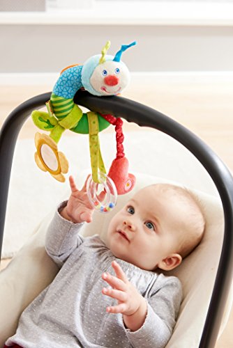 This cuddly rainbow worm curls up or around little explorers, providing exciting optic, haptic and acoustic features, not to mention good cheer! Made of polyester and plastic, this toy is suitable for babies from 6 months and up and is machine washable (air dry). Optimal for car seat, playpen or crib it curls up for easy attachment and soft dangling fun. Measures 4.5" wide x 9.75" high.