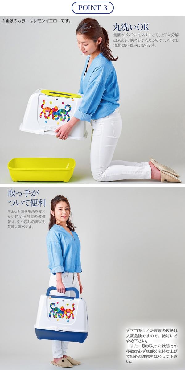ボディ表面に模様が入ったインテリア性の高いネコトイレです。フード付きで更に扉もついているので、砂やニオイが漏れにくくなっています。側面のバックルを外すことで、上下に分解して丸洗いも出来ます。 |