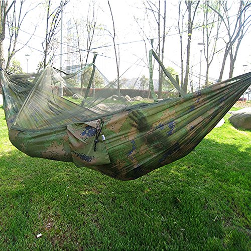 -. Feature : - Mosquito net can give you much better protection from those bothering mosquitos or other insects. / - Easy to be cleaned and dry quickly after being wet. / - Easy fixing, just fix the hammock with two binding strings and tie the string to the trees or poles. / - 210T parachute fabric material, wear resistance, anti-tearing, intolerance dirty, soft and comfortable when lying on it.