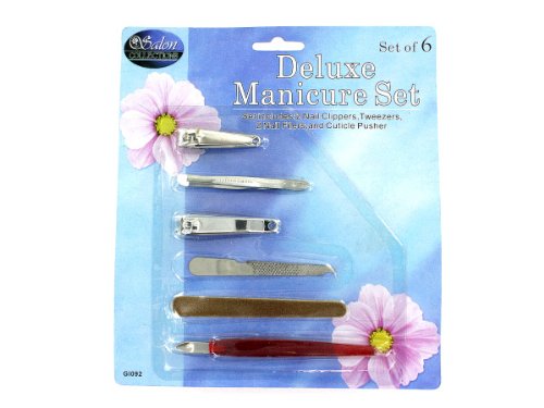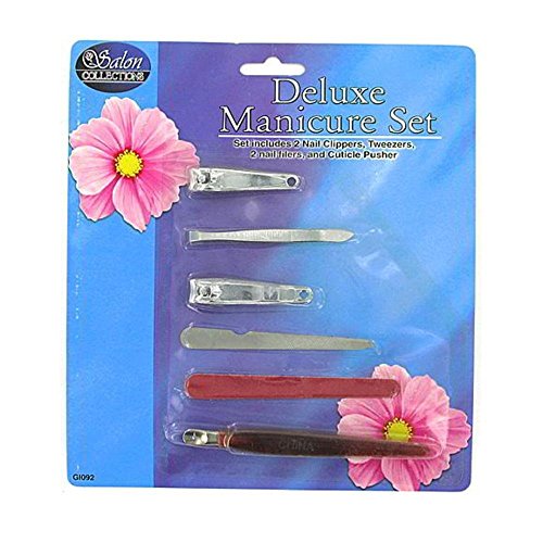 Studio : Salon Collections Publisher : Salon Collections Binding : Misc. Product Description This 6 piece manicure set includes: 2 nail clippers, tweezers, cuticle pusher and two different styles of nail files. Tweezers are blunt end, metal file has nail cleaner tip, emery board is double sided and nail clippers have key chain holes. The set comes in blister card package. 0