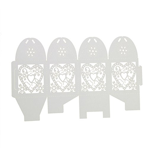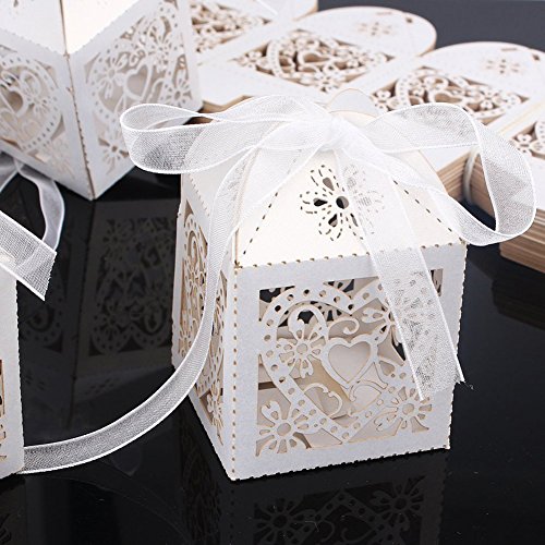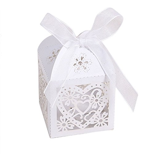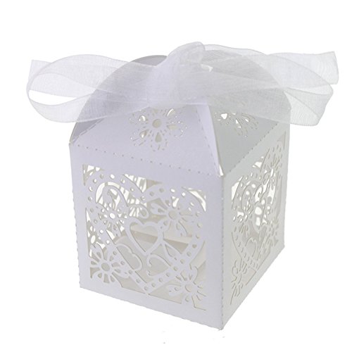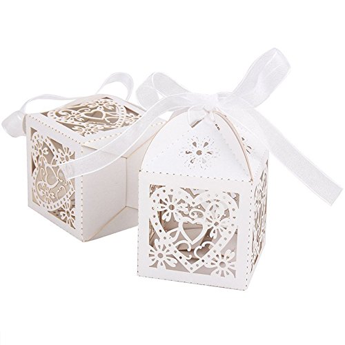 Laser Cut Pearl Paper Candy Boxes with Ribbons,Gift Box for Wedding Party Birthday Decoration Favor, 50 pcs(White)