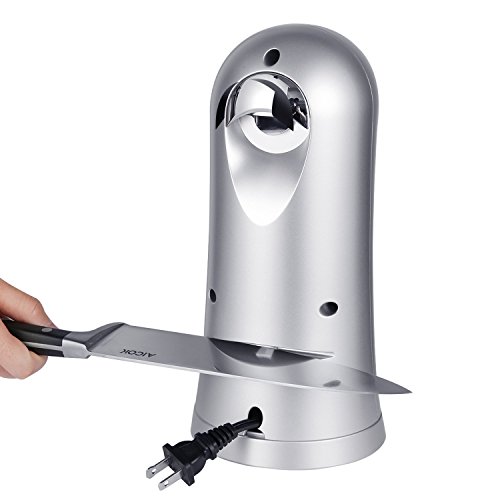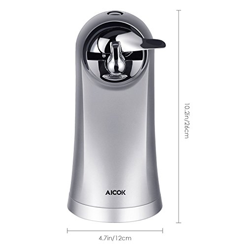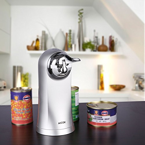 AICOK 3-In-1 Smooth Touch Can Opener can be used as electric can opener, bottle opener and knife sharpener. Unlike most can openers, this can opener is designed to cuts along the side and not into the top of the can, which minimizes the blades contact with food and prevents splashing or seeping out from the top since the can remains closed until you lift the lid.