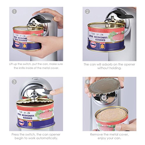 ✔ATTRACTIVE DESIGN - The nice looking of electric can opener designed with attractive silver body and sleek chrome cutting lever is definitely rustproof.
