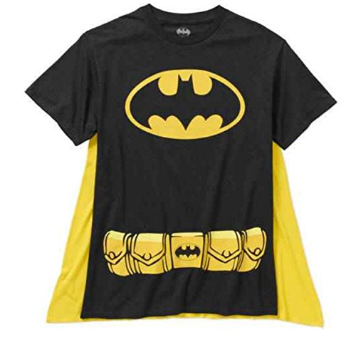 -. Binding : Apparel -. Brand : DC Comics -. Color : Black -. Department : Mens -. Feature : Adult Men Sizes / Front of the shirt features Batman / Shirt 100% Cotton / Cape 100% Polyester -. Label : DC Comics -. Manufacturer : DC Comics -. NumberOfItems : 1 -. ProductGroup : Apparel -. ProductTypeName : SHIRT -. Publisher : DC Comics -. Studio : DC Comics -. Title : DC Comics Men's Batman Costume T-Shirt with Cape