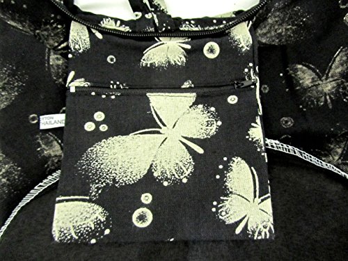 - Medium size butterfly crossbody purse made from 100% cotton. Includes top zip closure, nylon base interior lining, inner zippered pocket, and natural wood button closure for extra security. Light weight, thin and easy to fold and store in another bag.
