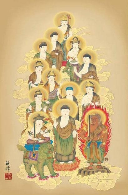 慶事におめでたい絵柄を飾るのと同じく、仏事には佛徳あふれる伝統の仏画を掛けるのが慣わし。繊細な線描で壮大な構図を丹念に描き上げました。 |