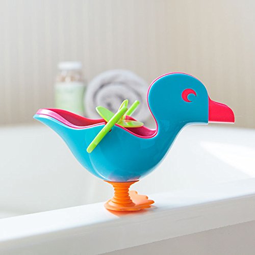 - Stackable duck-shaped bath toy with spinning propeller wings, suction cup feet, and water-pouring beak