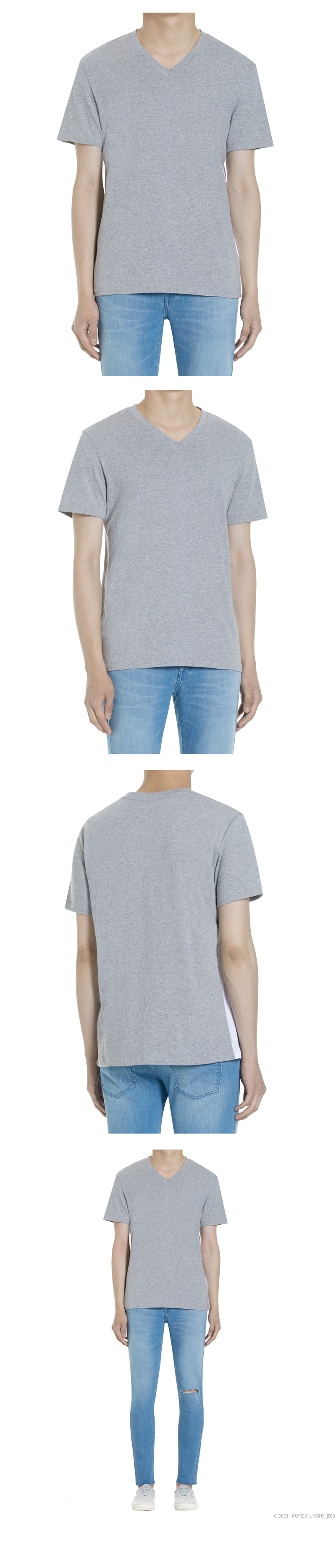 | - 기본 사이즈보다 작은 브이넥 티셔츠 - 옆 절개선 3CM 배색 작업 - 30'S 싱글원단 사용 - COTTON | |