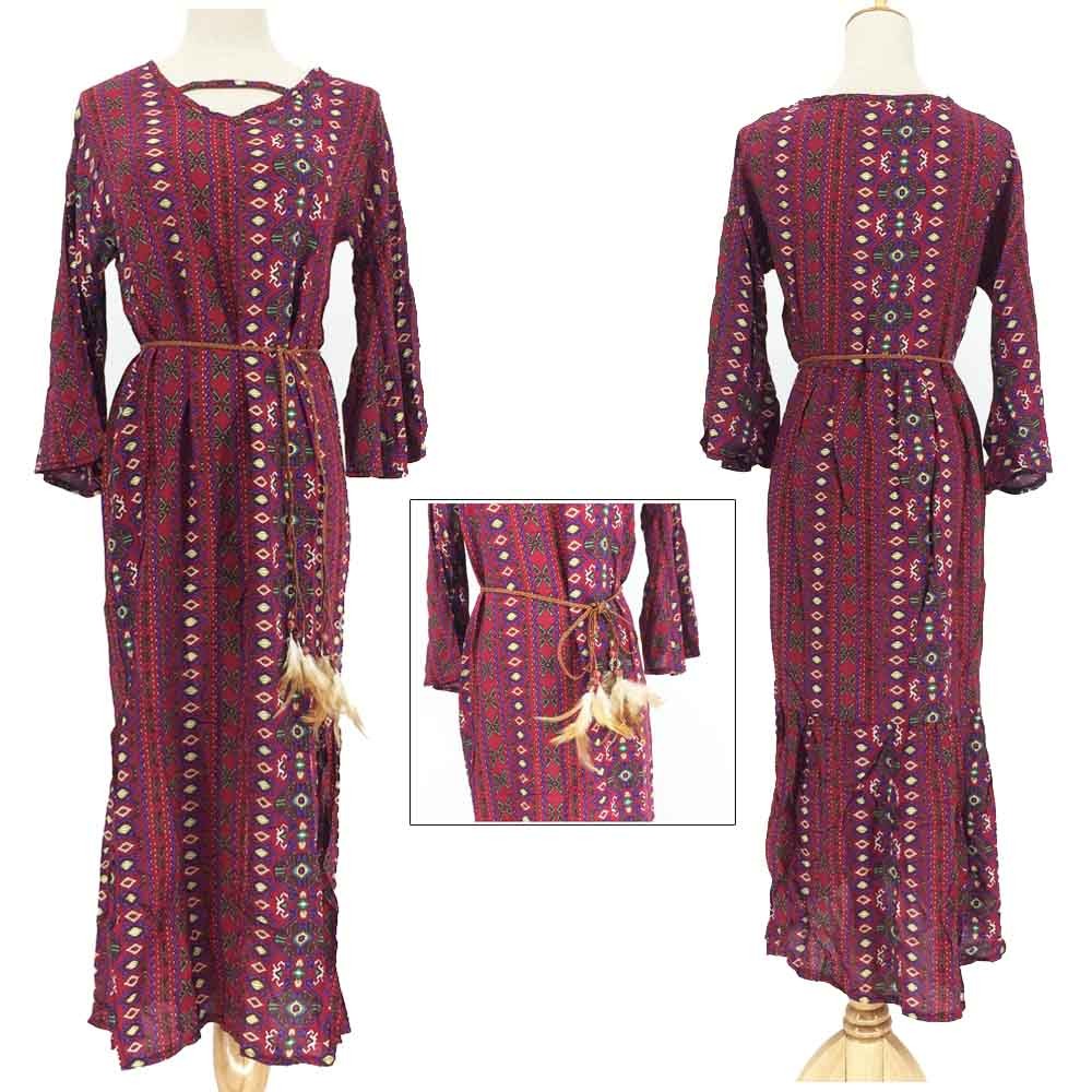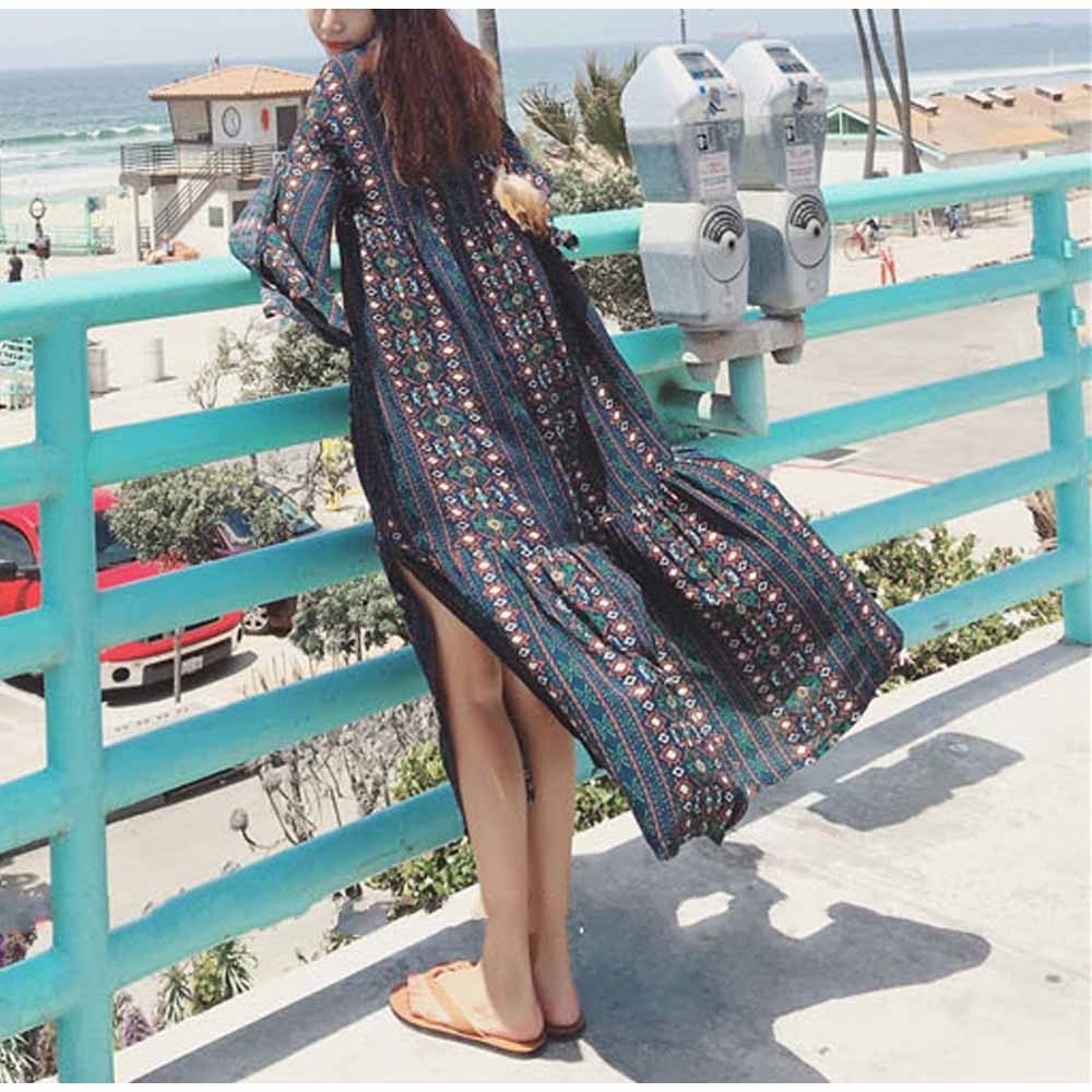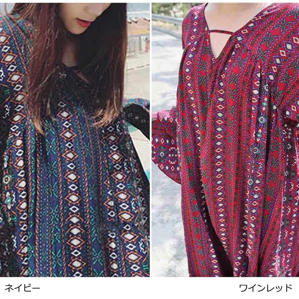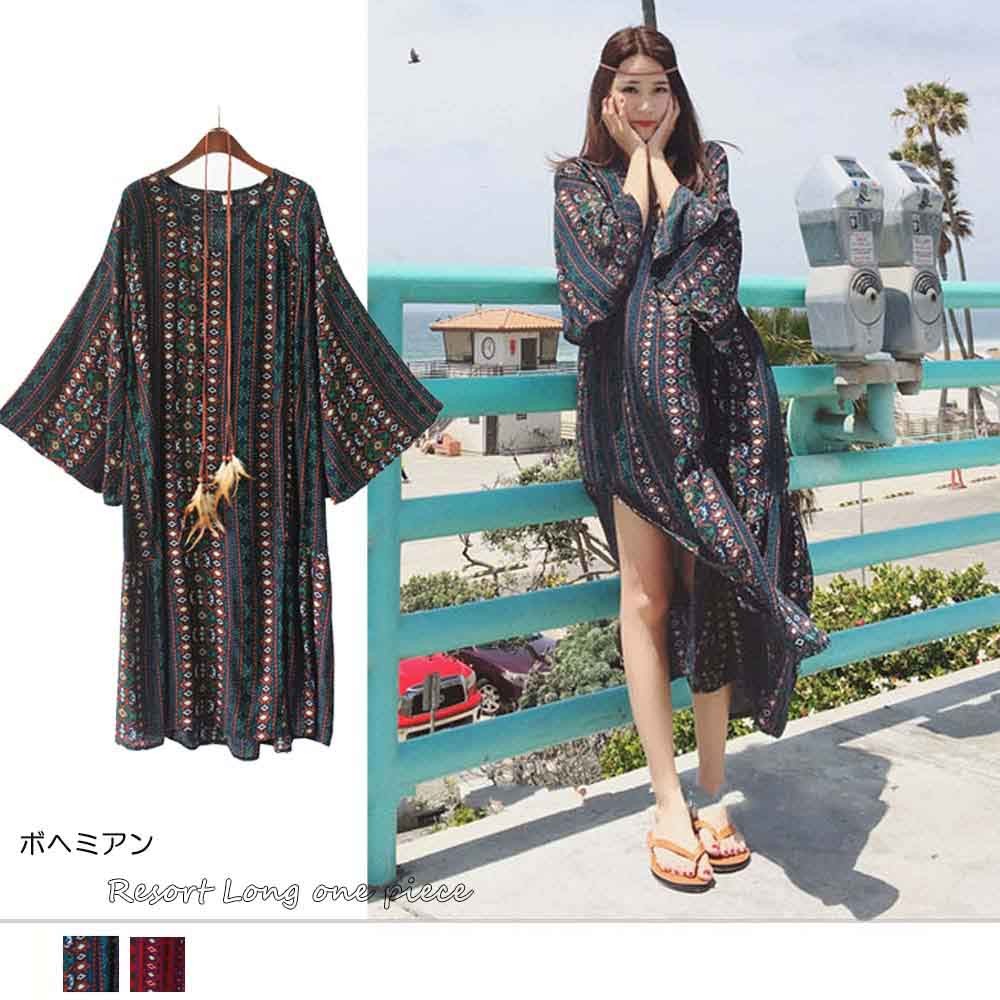 涼しげな総柄と色合いで夏らしい爽やかで華やかな長袖マキシワンピース