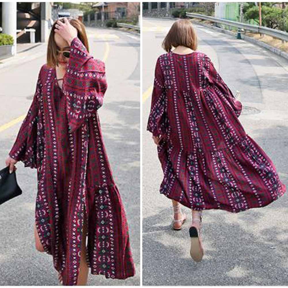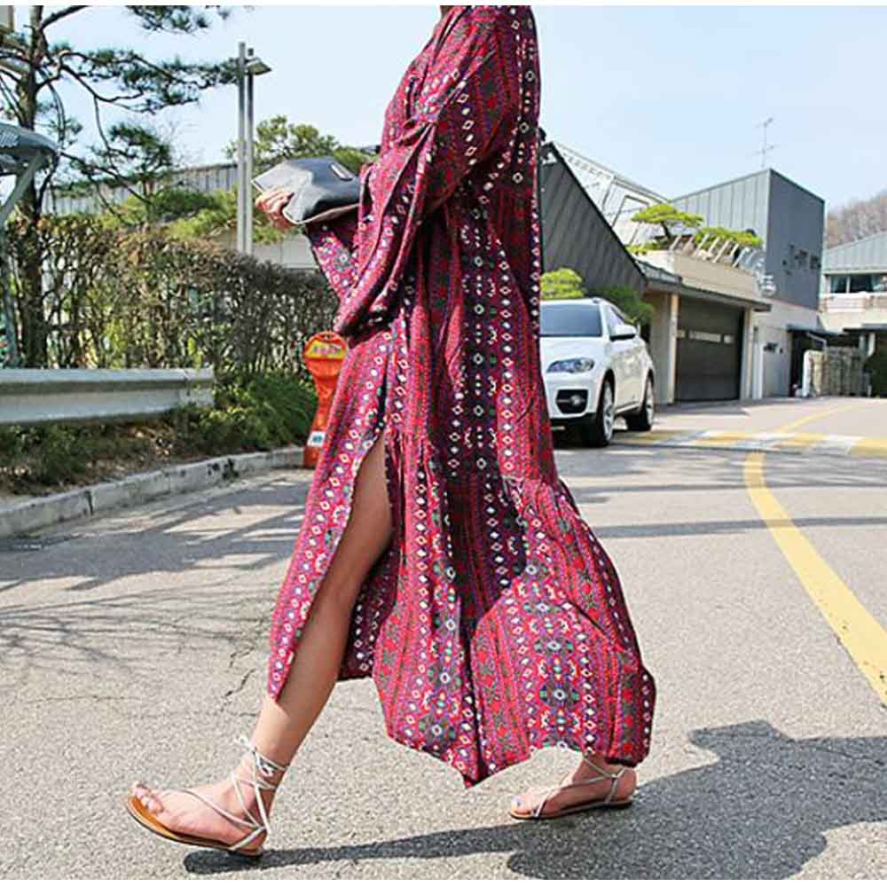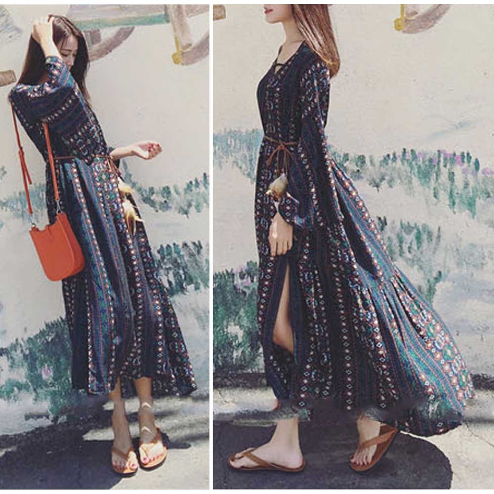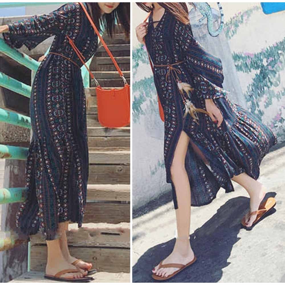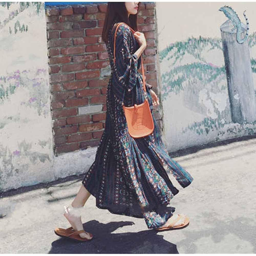 涼しげな総柄と色合いで夏らしい爽やかで華やかな長袖マキシワンピース