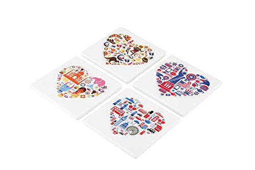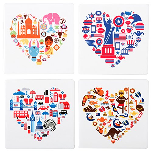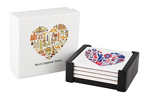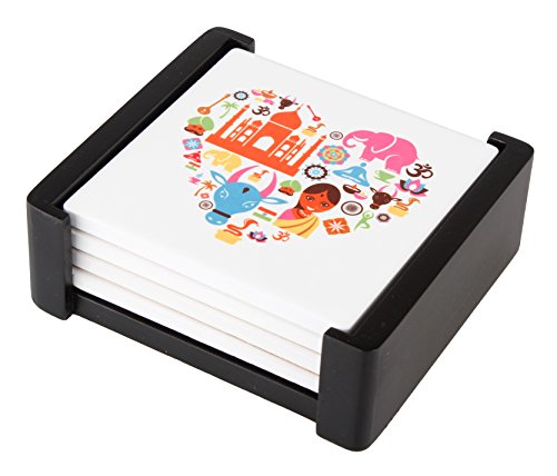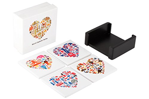 -. Brand : Planet Ethnic -. Color : Multicolor -. Feature : Special Offer: Buy any 2 or more Planet Ethnic products and save extra 10%. Use code '2G75WMDL' during checkout. / Set of 4 designer coasters for any travel enthusiast. Each coaster has famous icons for a different city or country. / A nice dark color wooden holder included with the pack, making it easier to store and display your nice coasters on any table. / Nice wide size, almost 4 X 4 inches making it ideal for everything from oversize beer mugs to large coffee mugs. Each coaster has soft cork back, making it scratch free for your tables. / High quality shiny finish ceramic really pops the vibrant color and design. A perfect souvenir or a gift. Packaged in a 'Ready to gift' pack. -. Label : All Ethnic Stuff LLC -. Manufacturer : All Ethnic Stuff LLC -. ProductGroup : Kitchen -. ProductTypeName : KITCHEN -. Publisher : All Ethnic Stuff LLC -. Size : 3.9 inches X 3.9 inches X 0.25 inch thick. -. Studio : All Ethnic Stuff LLC -. Title : Planet Ethnic World Explorer Ceramic Coaster Set (4 coasters, each almost 4 X 4 inches) with matching wooden coaster holder.