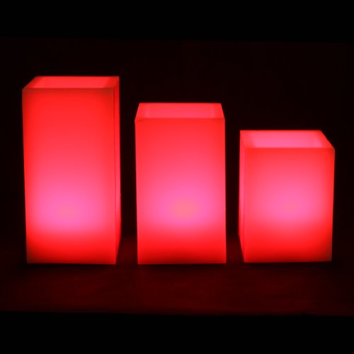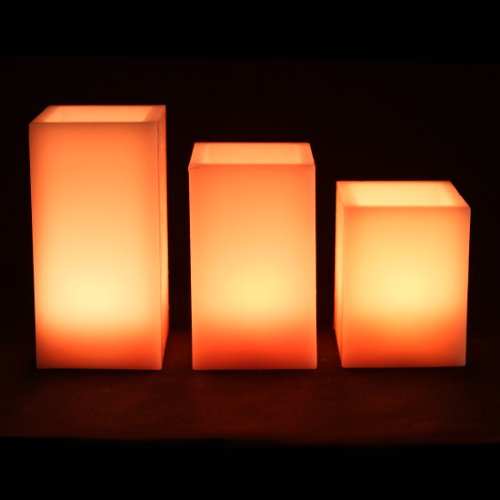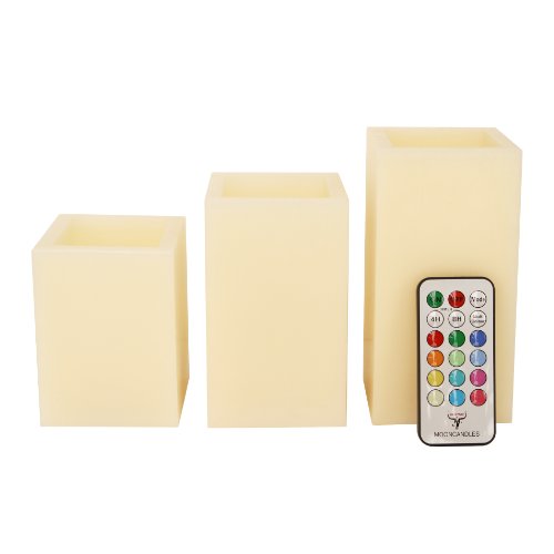 • Three 4'', 5'' and 6'' inch vanilla scented color changing flameless square candles with remote control and timer