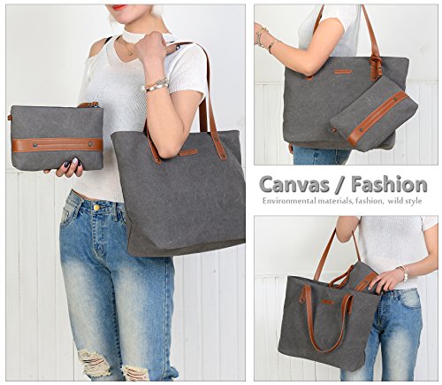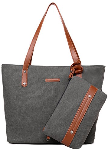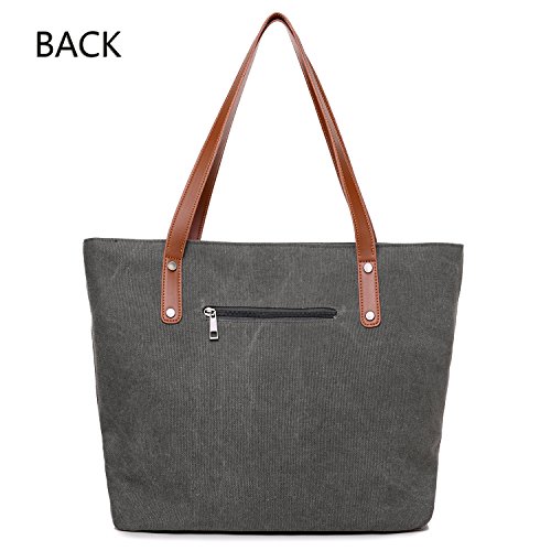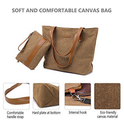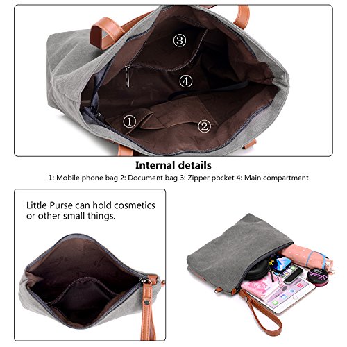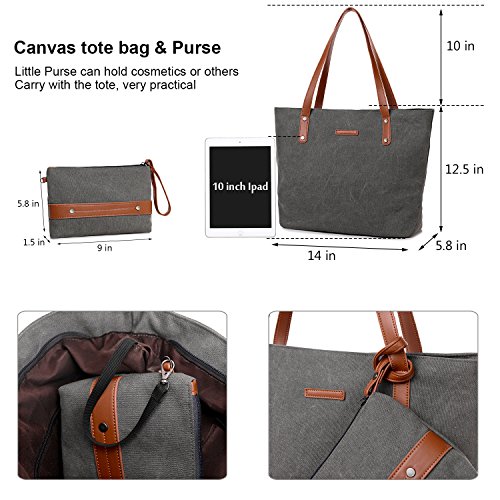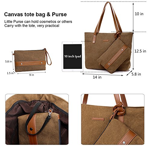 -. Feature : Material: High quality canvas, polyester lining / Leather & Canvas strap, sturdy and durable / Dimensions: 14''W x 12.5''H x 5.8''D. Shoulder Strap: 10''H / Large capacity: 1 main compartment, 1 interior zippered pocket and 2 slip pockets; 1 back zip pocket; 1 coin wallet included / Versatile Woman hand bag; Perfect for everyday work, commute, school, college, nursing and travel