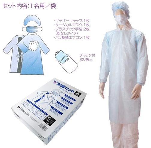 | セット内容 | ギャザーキャップ:1枚 サージカルマスク:1枚 プラスチック手袋(粉なしタイプ):2枚 ポリ長袖エプロン:1枚 チャック付ポリ袋 |
