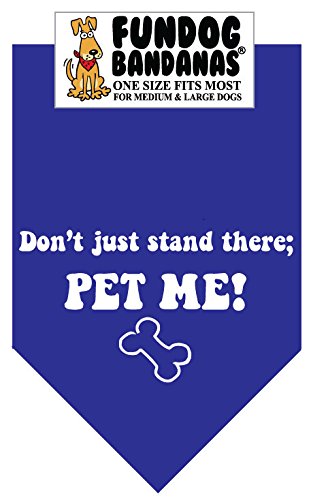 -. Binding : Misc. -. Brand : FunDog Bandanas -. Color : Royal Blue -. EAN : 0083351937034 -. Feature : Cute! / Fun! / Affordable! / Makes a great gift! / 22x22x31inches -. Label : The Dog Perk Corporation -. Manufacturer : The Dog Perk Corporation -. PackageQuantity : 1 -. ProductGroup : Pet Products -. ProductTypeName : PET_SUPPLIES -. Publisher : The Dog Perk Corporation -. Size : One size fits most for medium to large dogs -. Studio : The Dog Perk Corporation -. Title : BANDANA - Don't Just Stand There Pet Me for Medium to Large Dogs - royal blue -. UPC : 083351937034