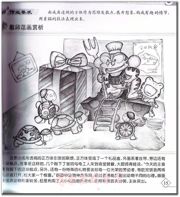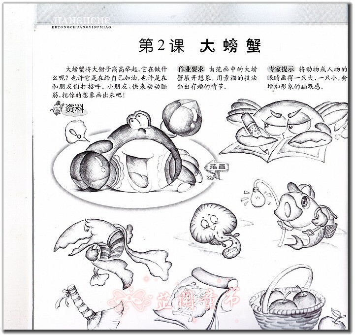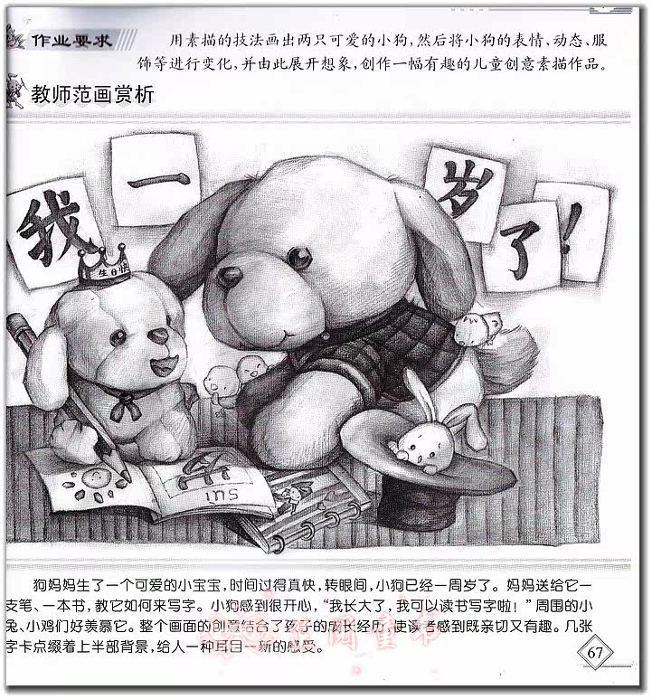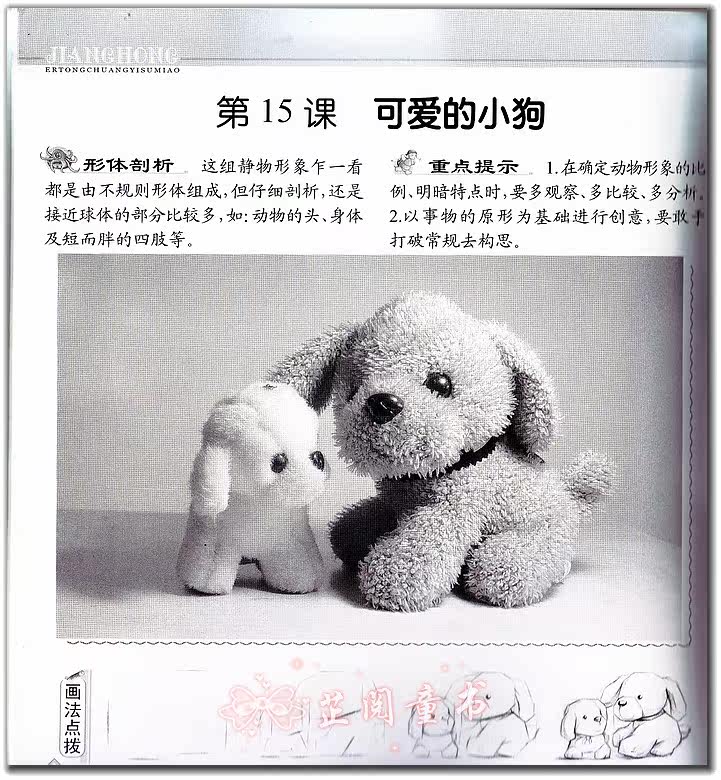 《姜宏儿童创意素描(下)》目录姜宏少儿美术教育儿童创意素描基础知识第1课 两个苹果第2课 盘子第3课 盘子与鸭梨第4课 菜刀与?炼?第5课 玻璃杯第6课 啤酒瓶第7课 两盒广告色第8课 一对小葫芦第9课 西瓜与石膏棱柱体第10课 水果与石膏罐子第11课 手纸盒与石膏组合体第12课 小狗与石膏棱柱体第13课 青蛙与石膏组合体第14课 企鹅与棱锥体第15课 可爱的小狗学生作品赏析