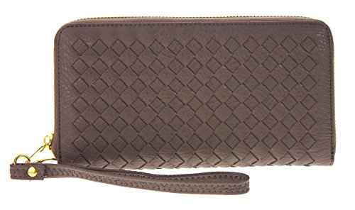 -. Feature : DESIGN: classic woven wristlet wallet. single zipper around closure at main compartment: 4 inner compartments, 2 side slip pockets, 1 zipper pockets, 8 credit card slots. / Material: Soft textured synthetic leather,solid-colored fabric lining, gold-tone hardware. / ACCESSORIES: this cross body bag comes with 1 detachable 8.5" wrist strap. / DIMENSIONS: exterior 7.75"Length X 4"Height X 1.25"Depth; / ORIGIN: Made in China
