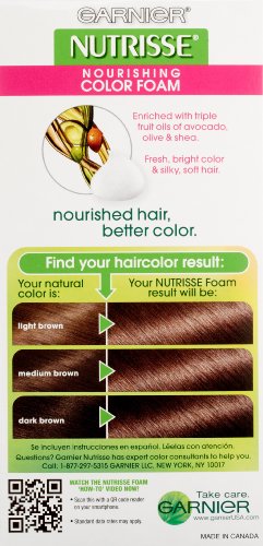 Garnier’s first foam that nourishes while it colors. Enriched with a triple fruit oil conditioner. Rich, bright, permanent color in an easy, stress-free application. Rich, bright, permanent color, the creamy foam saturates each strand to evenly deposit rich, radiant color from root to tip. Up to 100% gray coverage. Triple fruit oils, the avocado, olive and shea oil conditioner nourishes to protect against dryness, while locking in your radiant color and moisture. Leaves hair silky, soft and healthy looking. No stress, no mess application: Enjoy coloring your hair. The easy-to-use pump dispenses a non-drip, creamy foam that smells great and lathers-in like a shampoo. Quick and comfortable to apply, even when touching up roots. Mix it. Foam it. Use it. Nourished hair better color.Feature