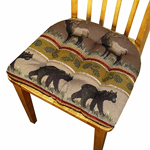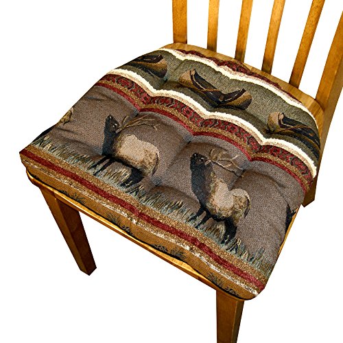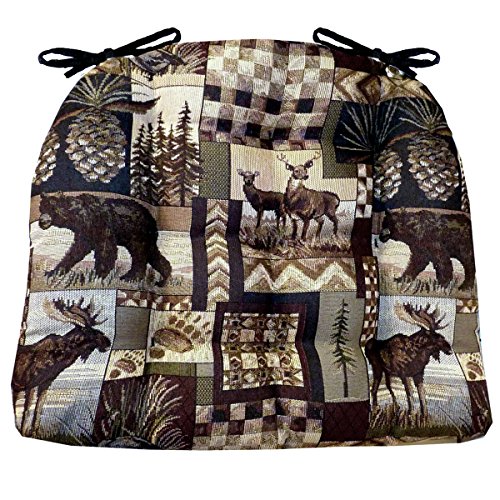 -. Binding : Kitchen -. Brand : Barnett -. Color : Multi -. Feature : Mattress-grade latex foam for premium comfort lasts longer than other foams and will never go flat (unlike polyester fiber fill) / Durable triple-stitched back-ties and lock-stitched seams / Spot Clean / Made in the USA with American-made and imported materials / Available in Standard or Extra-Large, click size for dimensions -. IsAutographed : 0 -. Label : Barnett Products -. Manufacturer : Barnett Products -. Model : 63081020 -. PackageQuantity : 1 -. ProductGroup : Home -. ProductTypeName : HOME -. Publisher : Barnett Products -. Size : 15"W x 17"D -. Studio : Barnett Products -. Title : Dining Chair Pad with Ties - Woodlands Lodge Collection - Latex Foam Fill Cushions - Rustic Log Cabin Decor