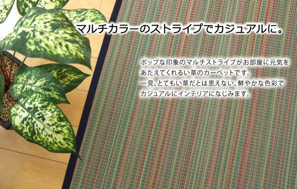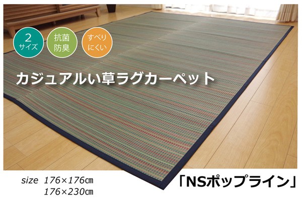 【商品名】 い草ラグカーペット カラフル 『NSポップライン』 約176×176cm (裏面:滑りにくい加工) 【ジャンル・特徴】 おしゃれ デザイン ラグマット ラグカーペット じゅうたん 絨毯 お洒落 ■サイズ・色違い・関連商品■約176×176cm[当ページ]■約176×230cm関連商品の検索結果一覧はこちら カラフルなデザインのい草ラグです。裏面には滑りにくい加工をした不織布を使用しているため、フローリングにも最適です。い草には空気の自然浄化作用、湿度の調節作用などがあります。い草に青森ヒバ加工を施しています。(抗菌、防臭効果)■商品スペック【サイズ】約176×176cm 2畳【素材】表地=い草 裏地=ポリエステル100%(不織布) ※滑りにくい加工 ※メセキ織ポリエステル100%※メセキ織 ヘリ=ポリエステル100%【洗濯表示】洗えません。【原産国】中国製【配送日時指定について】・この商品は、配送希望日と時間帯をご指定可能です。・配送希望日は出荷目安(最長)の 2 - 30 日後の間でご指定ください。・最短でのお届けをご希望の場合は「指定なし」を選択してください。※配送エ