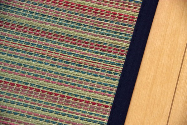 カラフルなデザインのい草ラグです。裏面には滑りにくい加工をした不織布を使用しているため、フローリングにも最適です。い草には空気の自然浄化作用、湿度の調節作用などがあります。い草に青森ヒバ加工を施しています。(抗菌、防臭効果)