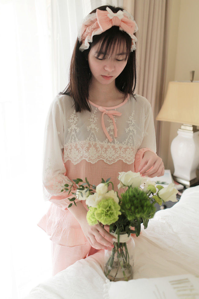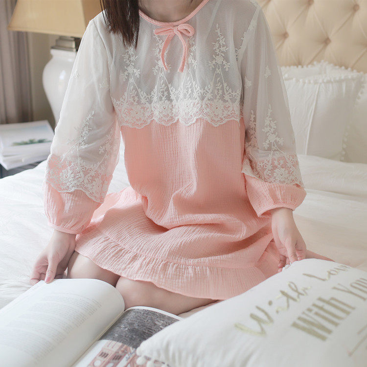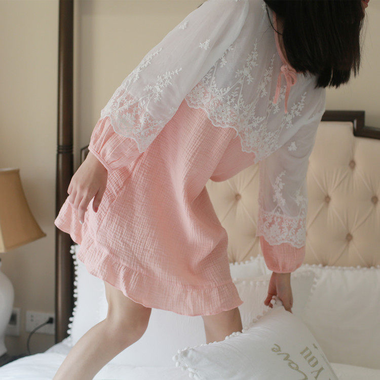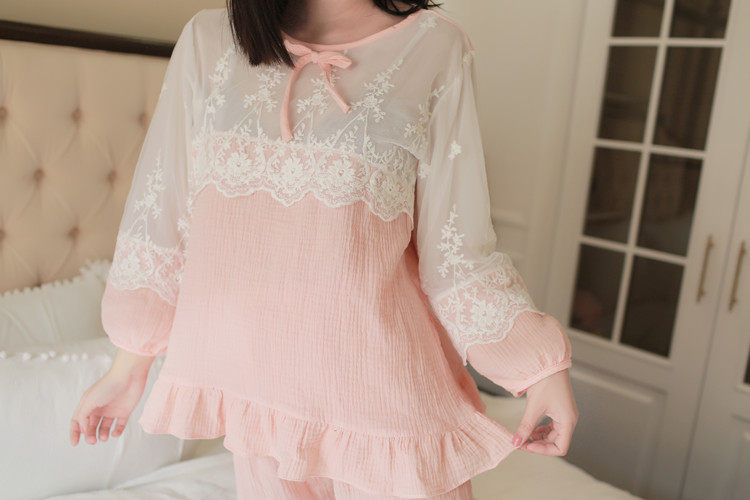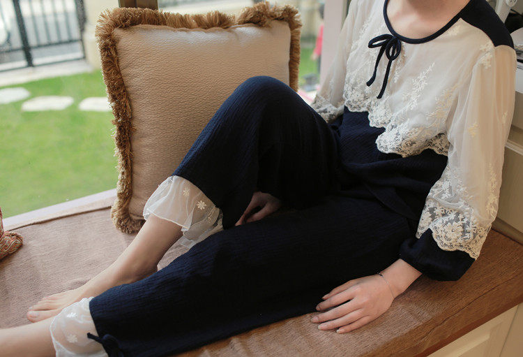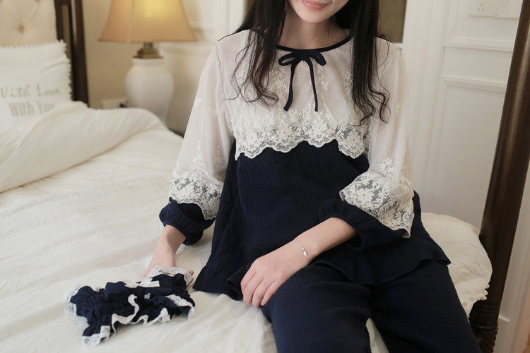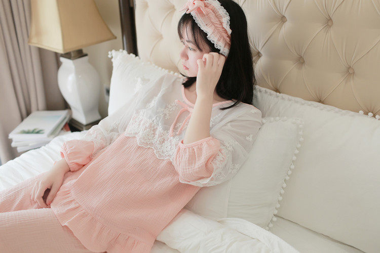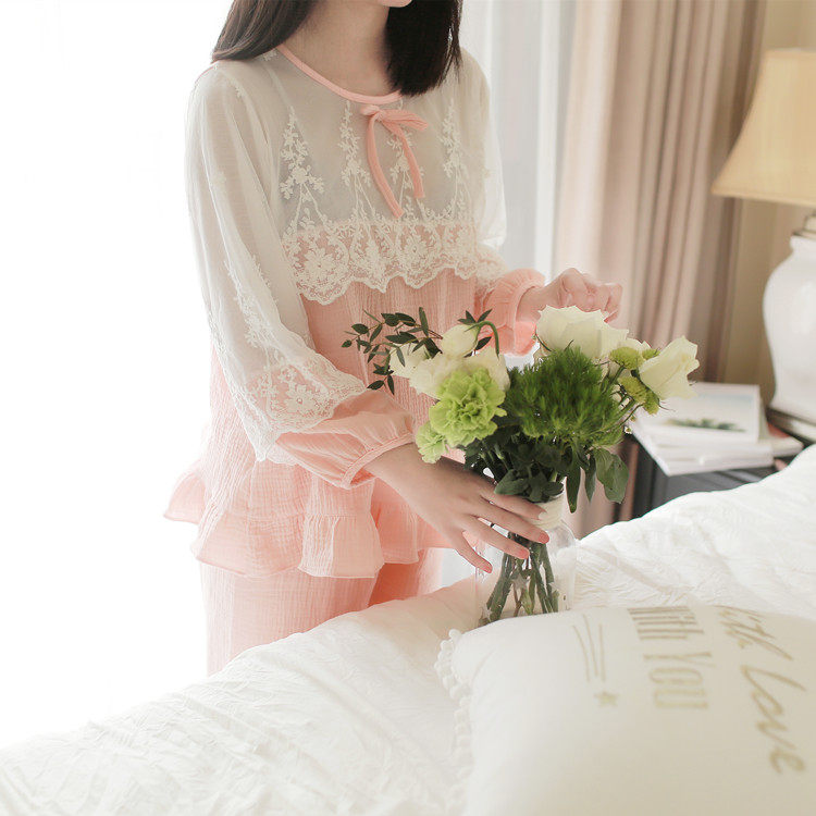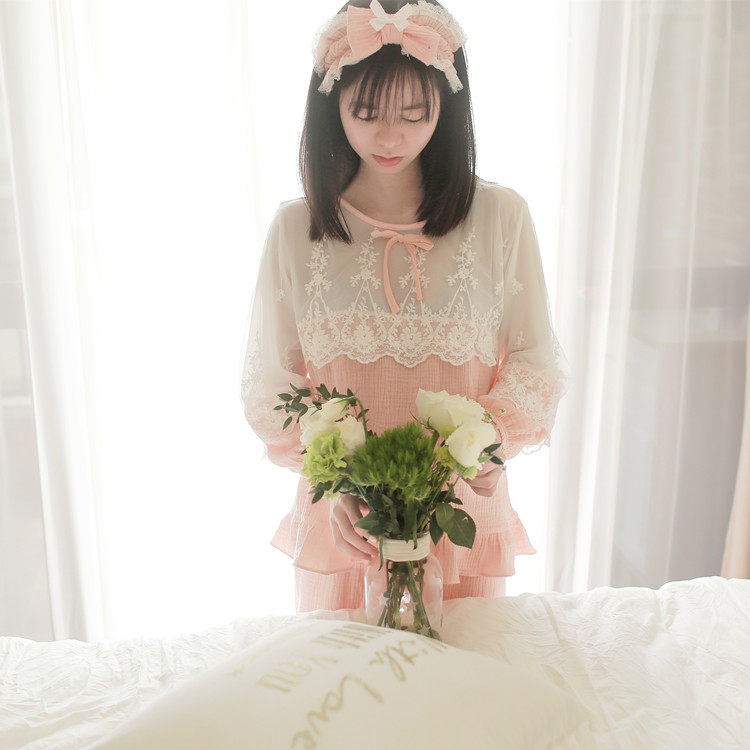 公主甜美睡衣蕾丝花边性感女神睡裙棉麻镂空日系家居服套装春夏季