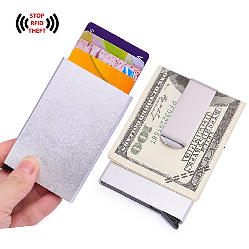 -. Feature : SIMPLE & EASY to USE -- One click action and credit cards auto pop-out gradually for easy finding, and cards won't fall out of sleeve. Comfortably holds 1-6 cards(ID, credit card, medical card, etc.) or 15 business cards. It can even hold ONE card and won't fall out. With Strong Money clip back that can easily carry more than 10 folded dollar bills. / PERSONAL SECURITY -- With the most secure RFID Blocking, thieves won't be getting anywhere near your credit cards, or ID information. / MINIMALIST DESIGN -- Slim wallet design that fits great in front or back pocket. Lightweight and slim body makes it is suitable to take out with you. No problem to keep it in your back pocket. No breaking, No bending. / MADE OF premium aviation aluminum and stainless steel clip, beautiful logo engraved by laser. High strength body ensure its long service life, full of metal texture give you unique touch feeling. / FOR WOMEN TOO -- Also use as a womens credit card holder. Keep your credit cards and ID organized and protected in your purse, clutch, or bag. No more digging through your wallet to find the card you were looking for.