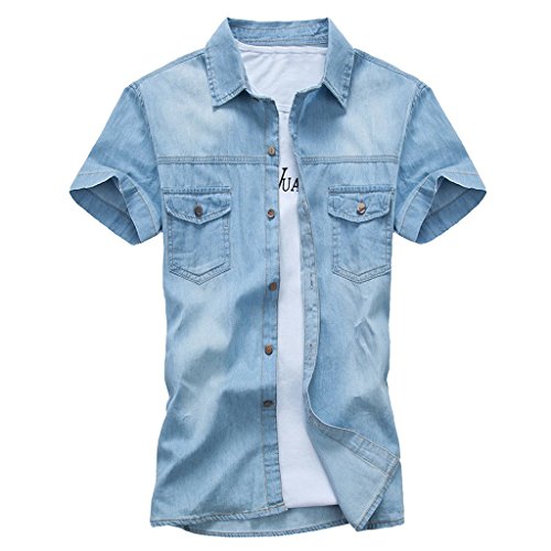 -. Binding : Apparel -. Brand : Stunner -. Department : mens -. Feature : Two chest pockets with button closure / Material:Cotton,Polyester / Square collar; Raglan sleeve / Made in China.Please note that:Better to select a larger size, since our size are measured by Asia size. / To ensure your best fit, please check the size clearly or contact with us before order -. ProductGroup : Apparel -. ProductTypeName : SHIRT -. Title : Stunner Men's Summer Slim Short Sleeve Casual Denim Shirt