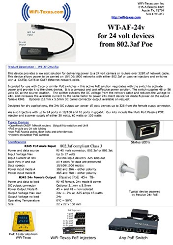 -. Feature : 24v 15 watt Splitter for Mikrotik, Ubiquiti or any 24 volt device / Adapter for any PoE switch to passive 24v devices / Also powers 24 volt cameras, heaters, IR displays etc / Handles Ethernet Data at 10 mb, 100mb or gigabit speeds / Expert USA Tech Support - call 512 479 0317