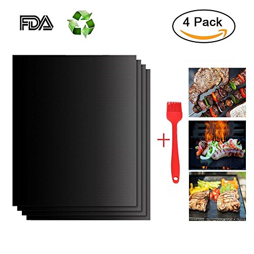 DIYANG Grill Mat Set of 4 and 1 Red Silicone Brush- 100% Non-stick BBQ Grill & Baking Mats - FDA-Approved, PFOA Free, Reusable and Easy to Clean - Works on Charcoal, Electric Grill -15.75 x 13 Inch