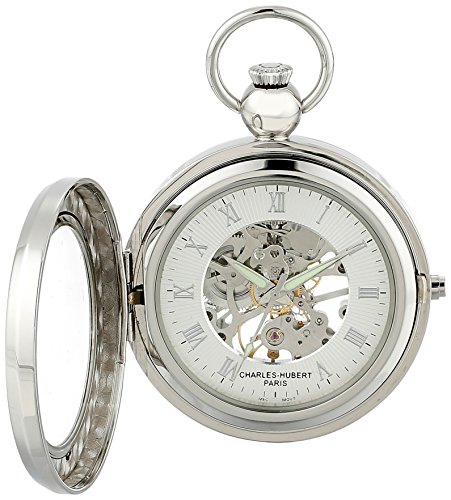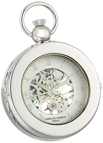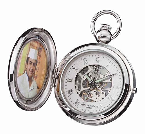 Amazon.com Product Description This Charles-Hubert Paris pocket watch comes with a lifetime movement warranty against manufacturing defects. Features include a front cover picture frame, 17 jewel mechanical movement, 48mm demi hunter case, matching chain, skeleton dial with roman numerals, and a deluxe gift box.