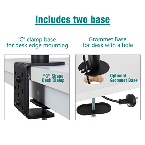 New user friendly. Simple assembly with only 6 parts. 2 mounting bases included, it can be installed at the edge of a desk with "C" clamp base or be installed with a hole on a desk with grommet base.
