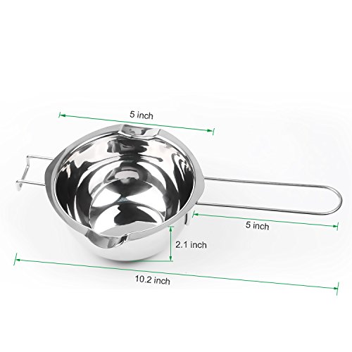 - FIT MOST POTS: Universal double boiler insert, perfect for most pots. Long handle is 5 inch, total length (handle to handle) 10.2 inch. Capacity 1/2 quarts (480ml). Front handle prevents sliding away.